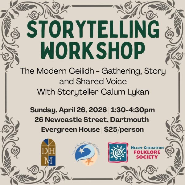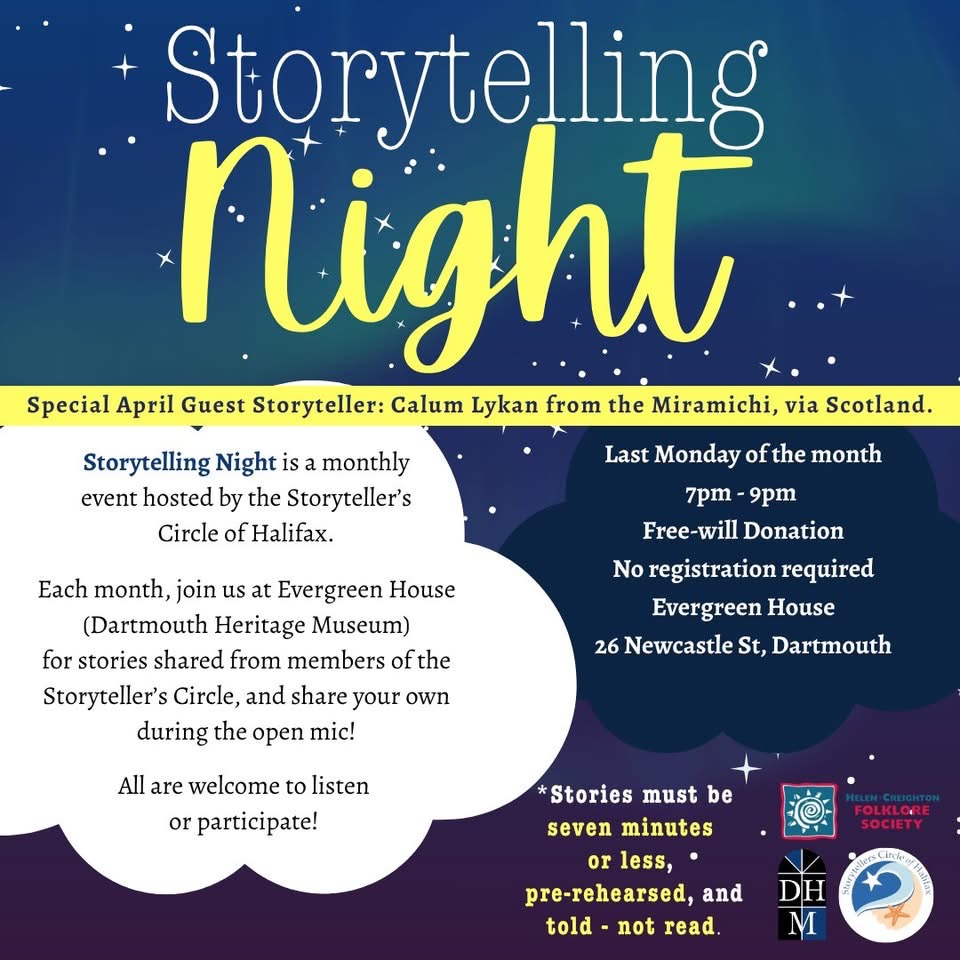 Join us at Evergreen House on Monday, March 30th for Storytelling Night – hosted by the Storytellers Circle of Halifax and the Helen Creighton Folklore Society.